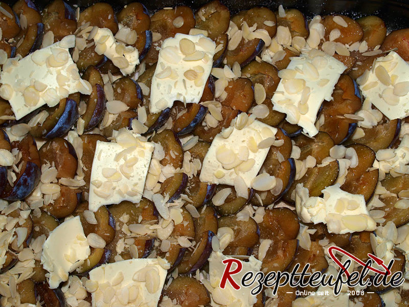 - Butter, Zucker und Mandeln auf den Zwetschgen