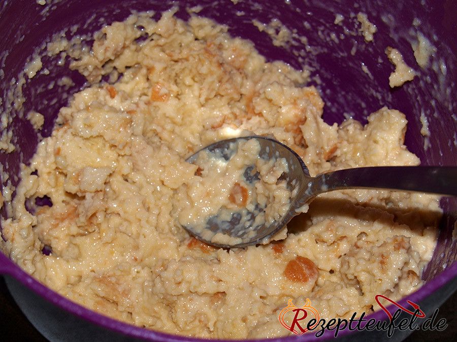 - Für die Brotspotzen werden die Brötchen in kleine Stücke zerrupft und mit dem Ei, dem Mehl und der Milch vermengt. Mit Muskat abschmecken.2 Brötchen, 1 Ei, 50 g Mehl, 125 g Milch, 1 Msp geriebene Muskatnuss