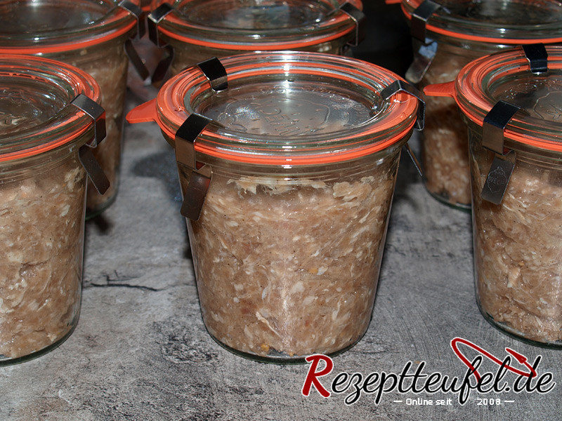 - Alle Zutaten inkl. der gedünsteten Zwiebeln in eine Schüssel geben. 5 bis 10 Minuten in einer Küchenmaschine oder mit dem Handrührgerät gut vermengen, bis eine gut gebundene, verklebte Masse entstanden ist. Die ausgekochten Gläser maximal zu 3/4 mit der Masse befüllen, den Rand der Gläser säubern und mit den Deckeln (bei Weckgläsern mit Gummi, Deckeln und Klammern) verschließen.