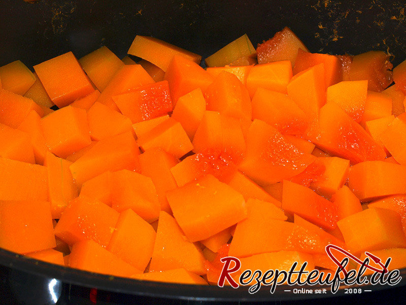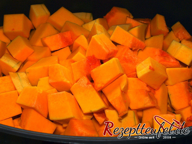 - Den Kürbis schälen (bei Hokkaido eigentlich nicht notwendig, in diesem Fall jedoch sinnvoll damit keine Erdreste oder sonstigen Verschmutzungen anhaften können), die Kerne entfernen und das Kürbisfleisch in grobe Würfel schneiden. Die Kürbiswürfel mit dem Wasser in einer beschichteten Pfanne oder einem Topf zum Kochen bringen. Den Kürbis 15 bis 20 Minuten mit geschlossenem Deckel kochen und den gegarten Kürbis mit einem Passierstab sehr fein pürieren.