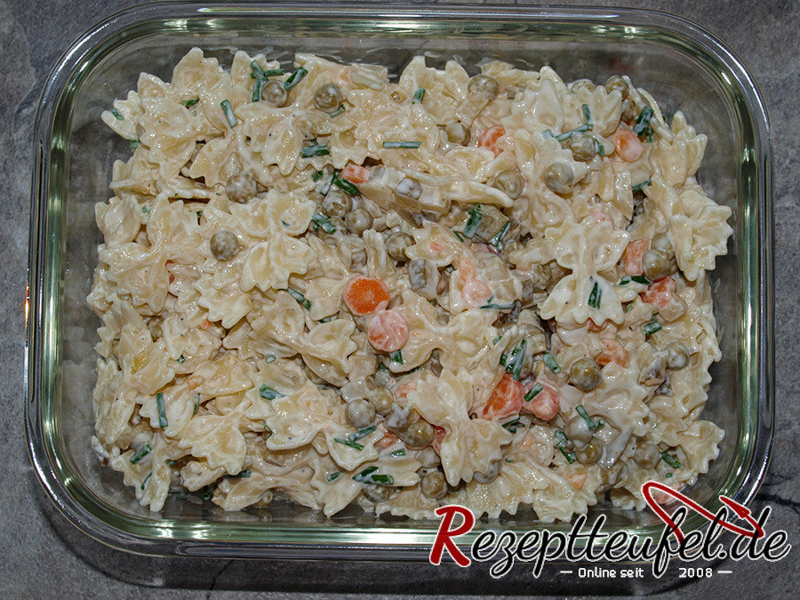 Das Rezept für Nudelsalat mit Mayonnaise-Joghurt-Dressing wie wir es zubereiten: