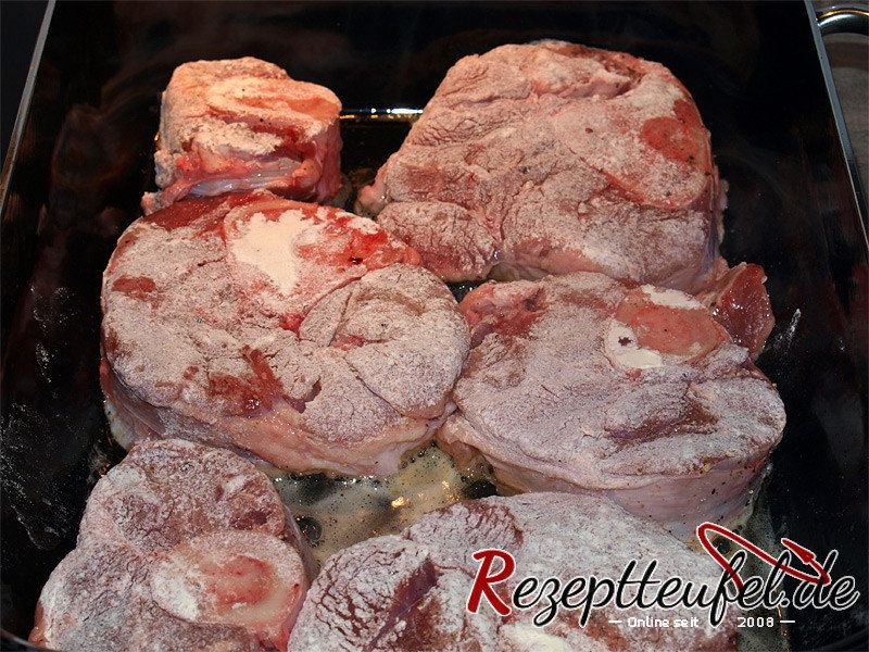 - Das Gemüse in die Pfanne geben in der vorher das Fleisch angebraten wurde und anschwitzen. Das Tomatenmark hinzufügen und anrösten. Mit der Hälfte vom Wein ablöschen und reduzieren lassen bis die Flüssigkeit fast ganz verdampft ist. Den Rest vom Wein angießen und etwas einreduzieren. Die Brühe hinzugießen, aufkochen lassen und das Fleisch hinzufügen.Das Kochgefäß mit geschlossenem Deckel im Backofen ca. 120 bis 150 Minuten garen bis das Fleisch weich ist und fast vom Knochen fällt.50 g Tomatenmark, 200 ml Weißwein, 500 ml Brühe