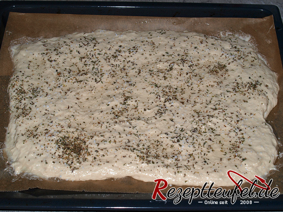 - Ein Backblech mit Backpapier auslegen, darauf den Teig geben und mithilfe eines nassen Löffels auf dem Backpapier verstreichen bis 2/3 des Blechs bedeckt ist. Das Öl auf dem Teigfladen verteilen, mit Salz und den Kräutern bestreuen.