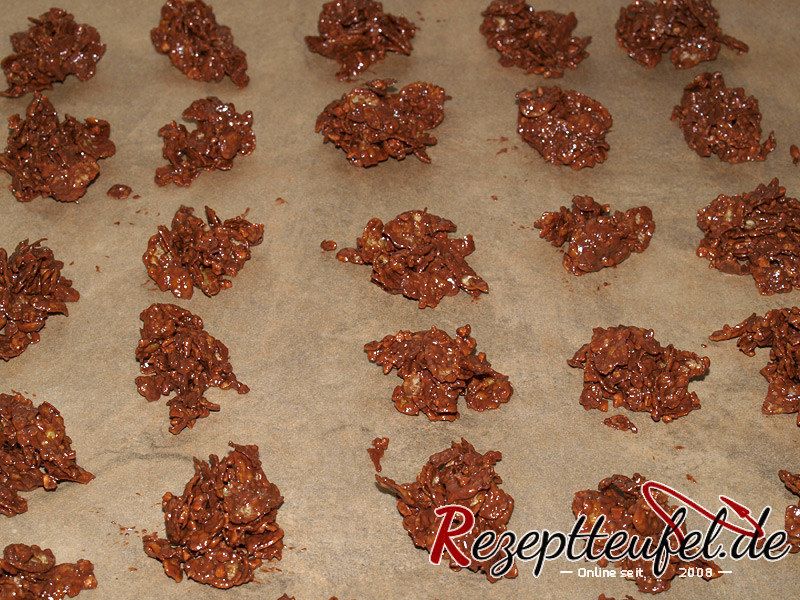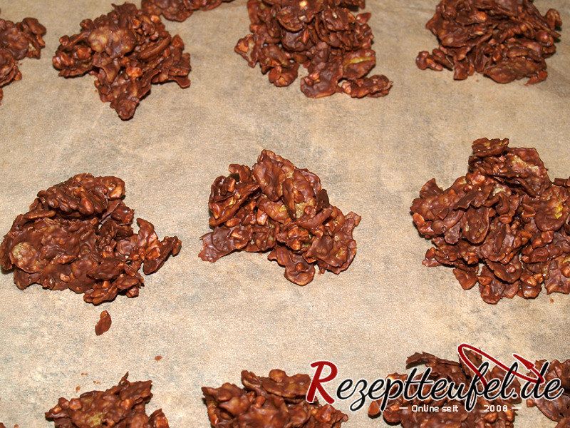 - Mit zwei Teelöffeln Häufchen von der Masse auf ein bis zwei Blätter Backpapier geben. Die Schoko Crossies stehen lassen, bis die Schokolade wieder fest geworden ist.