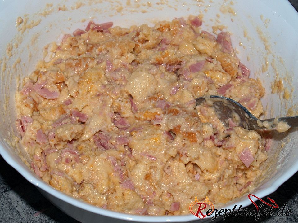 - Inzwischen für die Brotspotzen die Brötchen in kleine Stücke zerrupfen und den gekochten Schinken in Streifen schneiden.Die Brötchenteile jetzt mit dem Ei, dem Mehl und der Milch vermengen. Mit frisch geriebener Muskatnuss und etwas Salz abschmecken. Die Schinkenstreifen unter den Teig mengen, einen Teelöffel in Wasser tauchen und damit die Brotspotzen in Form von Nocken aus dem Brötchenteig abstechen.2 Brötchen, 1 Ei, 50 g Mehl, 125 g Milch, 1 Msp geriebene Muskatnuss, 75 g gekochter Schinken, - - Salz