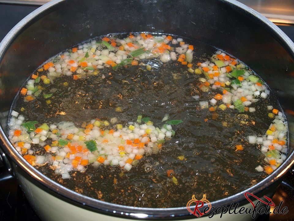 - 50 g Suppengemüse (aus Möhren, Sellerie, Porree sehr fein geschnitten)
