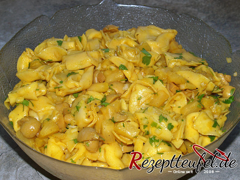 Einen besonderen Pfiff bekommt diese Variante eines Nudelsalat durch die Würzung mit Currypulver. Aufgrund des Aromas und der milden Schärfe verwenden und empfehlen wir Curry Madras mild. Die gelbe Farbe des Currypulvers verleiht dem Nudelsalat mit Tortellini eine appetitliche Farbe.