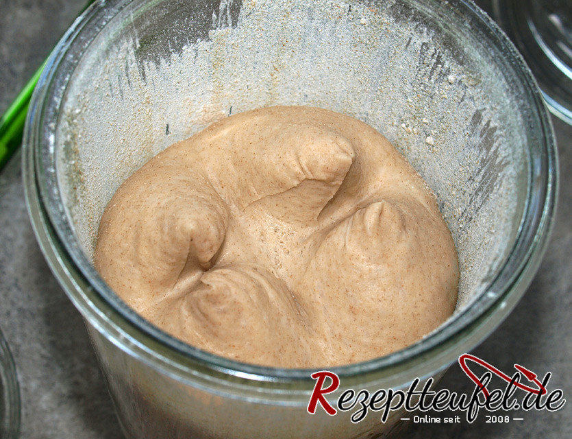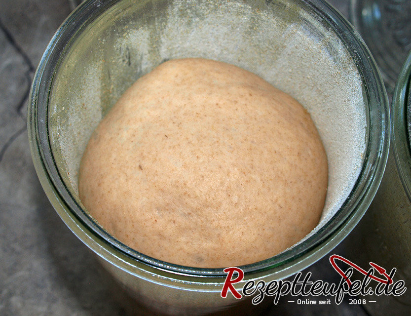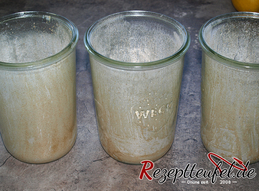 - Die sauberen Gläser mit Butter einfetten und dünn mit Roggenmehl ausstreuen.Den Teig in 4 Stücke zu jeweils 225 g teilen, mit Gefühl zu Kugeln formen und je eine Kugel in ein ausgestreutes Glas geben. Die Gläser mit einem Tuch abdecken und den Teig ca. 1,5 bis 2 Stunde(n) gehen lassen. Der Teig sollte sich deutlich vergrößert haben.